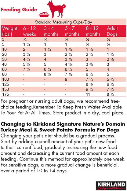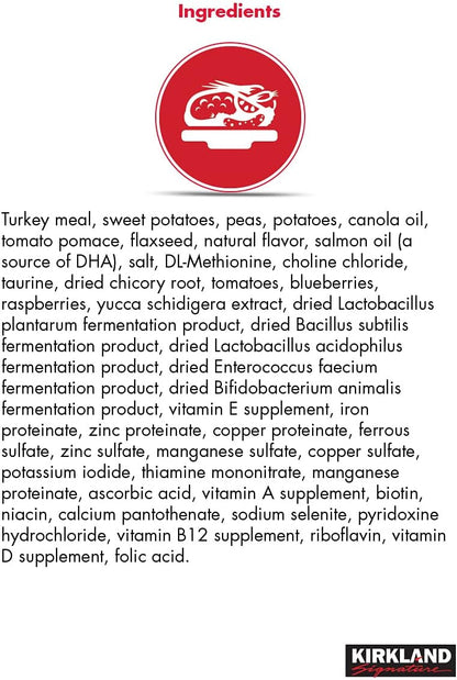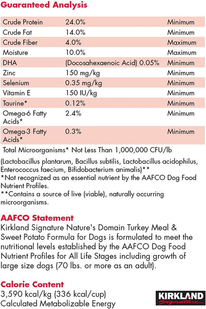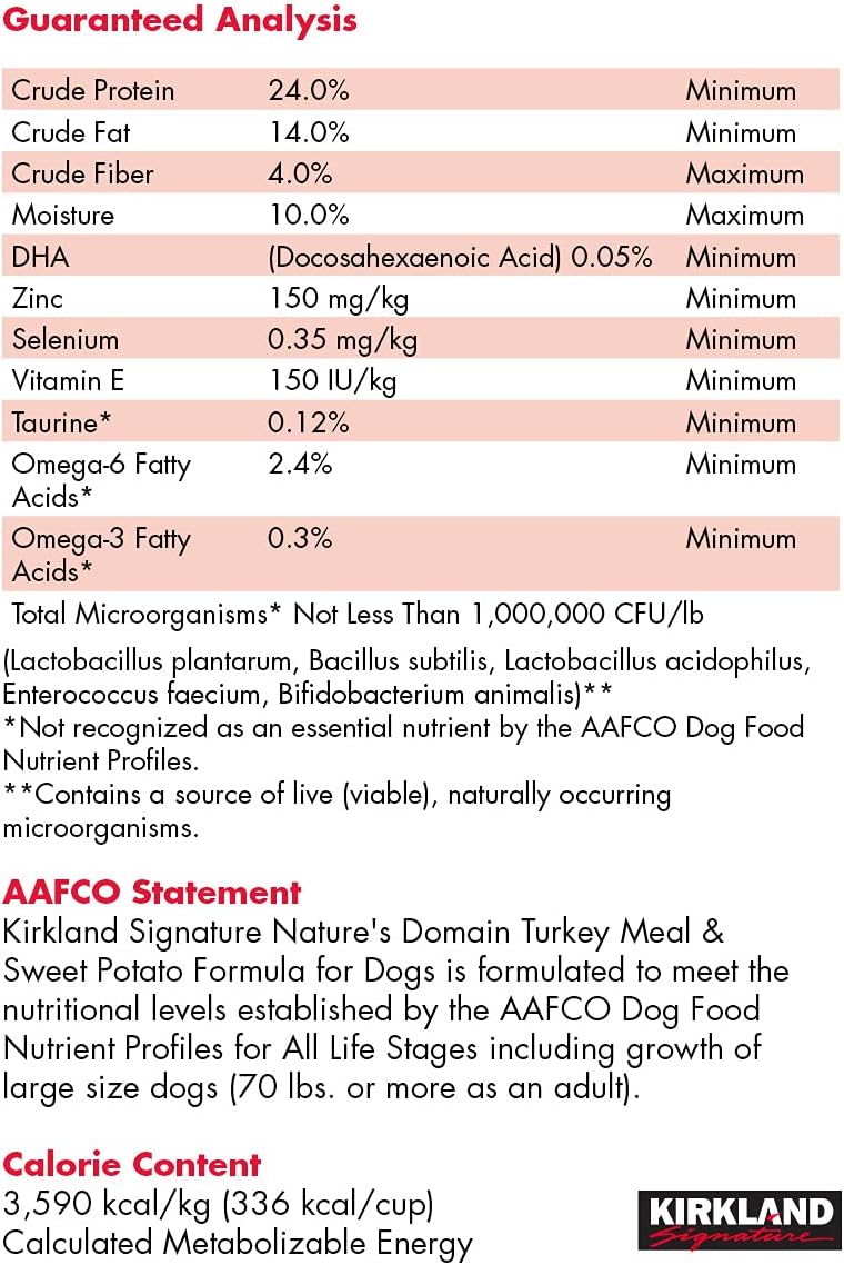 Kirkland Signature de la naturaleza dominio Turquía comida & Sweet Patatas fórmula para perros está formulado para satisfacer las necesidades nutricionales para todas las etapas de la vida, desde cachorros a senior perros. Fabricado con Turquía comida, una fuente de proteína de calidad, y complementada con antioxidantes y ácidos grasos omega, esta fórmula ofrece gran nutrición para la salud general y vitalidad para todo tipo de perros.