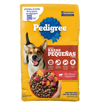 PEDIGREE Croquetas Adulto Razas Pequeñas con Res y Vegetales es un alimento seco completo especialmente formulado para perros adultos de razas pequeñas, con croquetas adaptadas a su tamaño y necesidades. Contiene res como fuente de proteína que ayuda a mantener músculos fuertes, además de vegetales que aportan nutrientes esenciales para una digestión saludable y un bienestar diario equilibrado. Ideal para la alimentación cotidiana de perros pequeños.