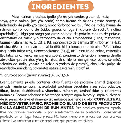 Purina Beneful Salud Radiante Adulto Sabor Salmón es un alimento seco completo para perros adultos de todos los tamaños, formulado para apoyar la salud desde el interior. Contiene salmón como fuente de proteína, además de ingredientes como arándano, chía, kale y betabel que aportan antioxidantes y favorecen la salud digestiva, ayudando a mantener músculos fuertes y un estado físico saludable. Su fórmula no contiene colorantes ni saborizantes artificiales, ideal para la alimentación diaria.