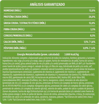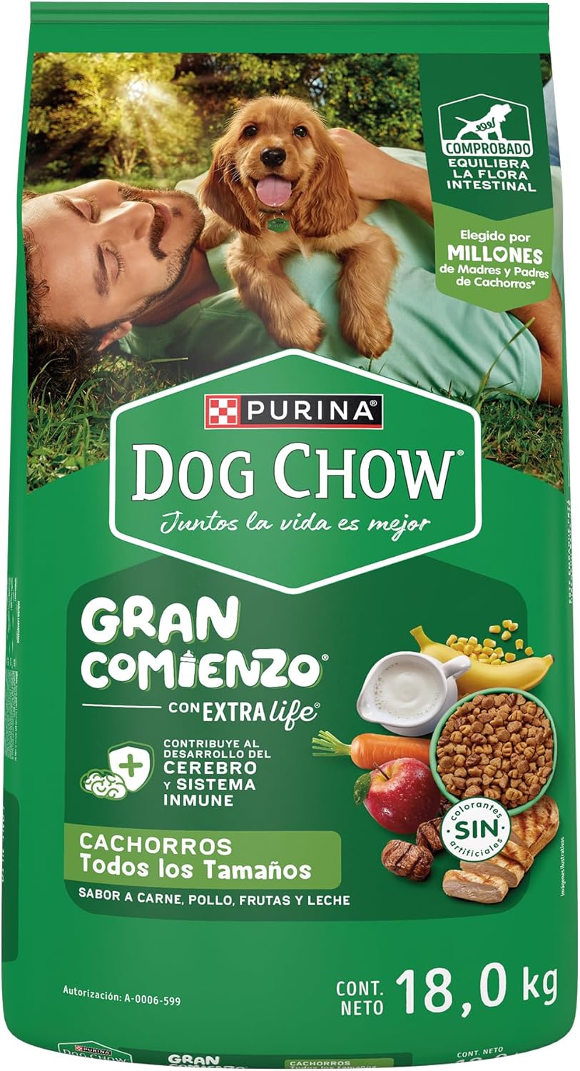 Purina Dog Chow Puppy presenta una fórmula avanzada diseñada específicamente para cachorros de todas las razas y tamaños. Este alimento en croquetas, elaborado sin colorantes artificiales, contiene la tecnología ExtraLife que optimiza la calidad de vida durante esta etapa crítica del desarrollo. La composición nutricional favorece el desarrollo cerebral y la función visual, aspectos fundamentales en los primeros meses de vida. Ideal para el período de destete, esta presentación de 18 kg proporciona nutrición completa y equilibrada con sabores naturales de carne y pollo que los cachorros disfrutan.